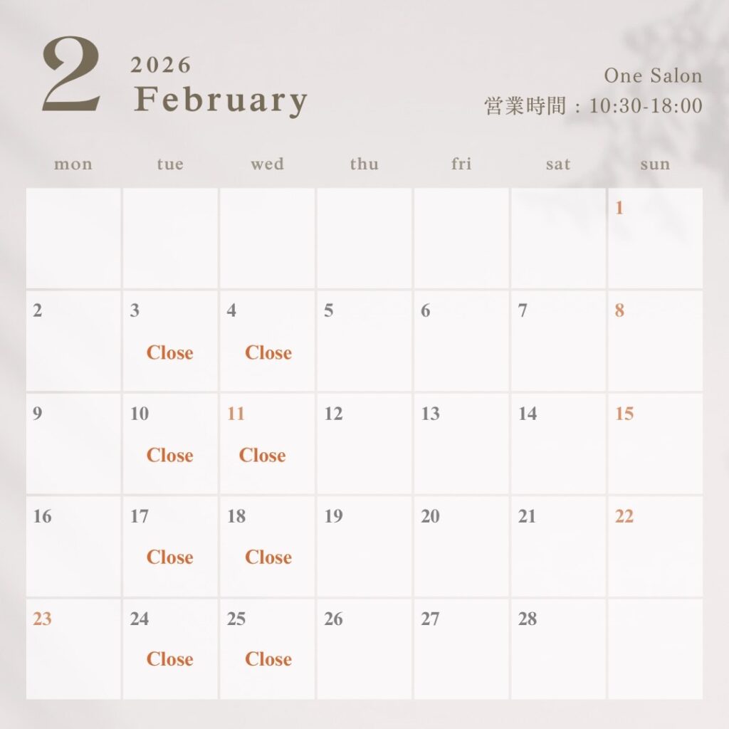2026年2月~営業案内~ 投稿日 2026年1月25日 著者 onesalonhp カテゴリー お知らせ Close・・・定休日(火・水) セルフ脱毛OneSalon姫路飾磨店営業時間 10:30~18:00お問い合わせ:079-289-5889