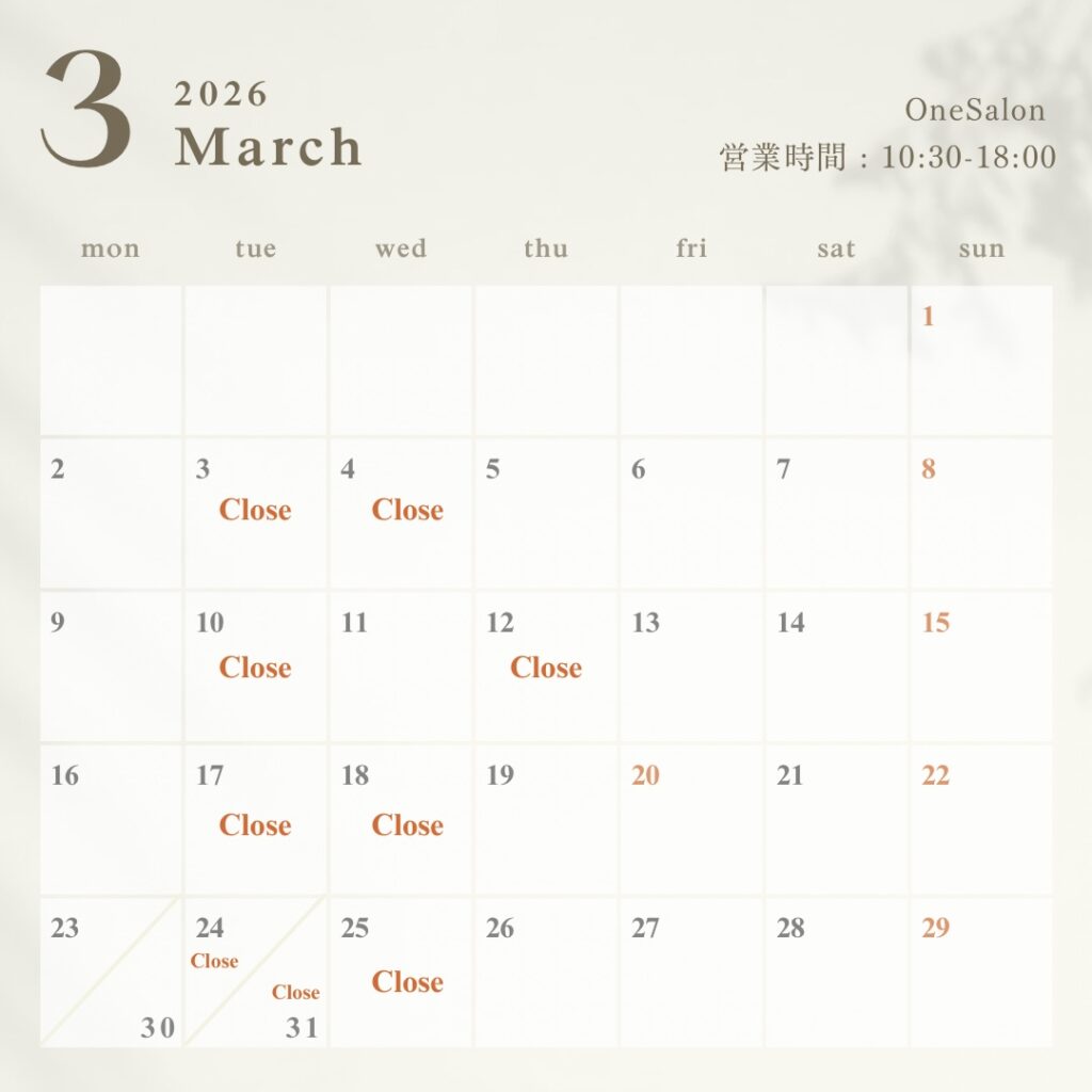 2026年3月~営業案内~ 投稿日 2026年3月5日 著者 onesalonhp カテゴリー お知らせ Close・・・定休日(火・水) ※変更あり セルフ脱毛OneSalon姫路飾磨店営業時間 10:30~18:00お問い合わせ:079-289-5889
